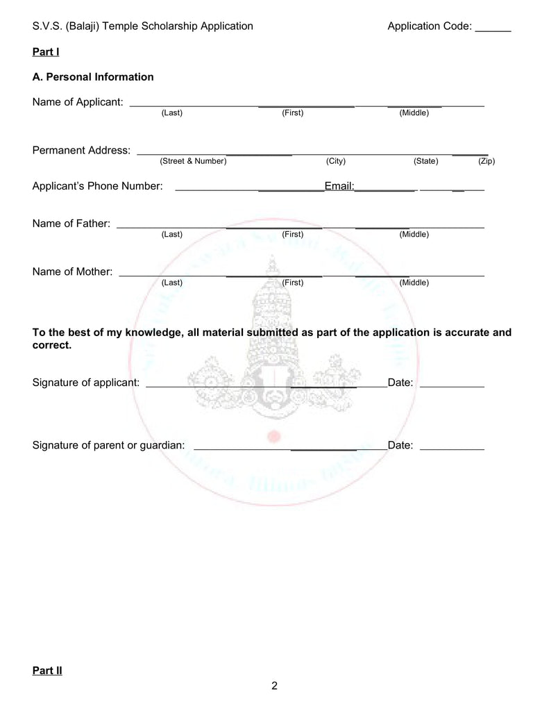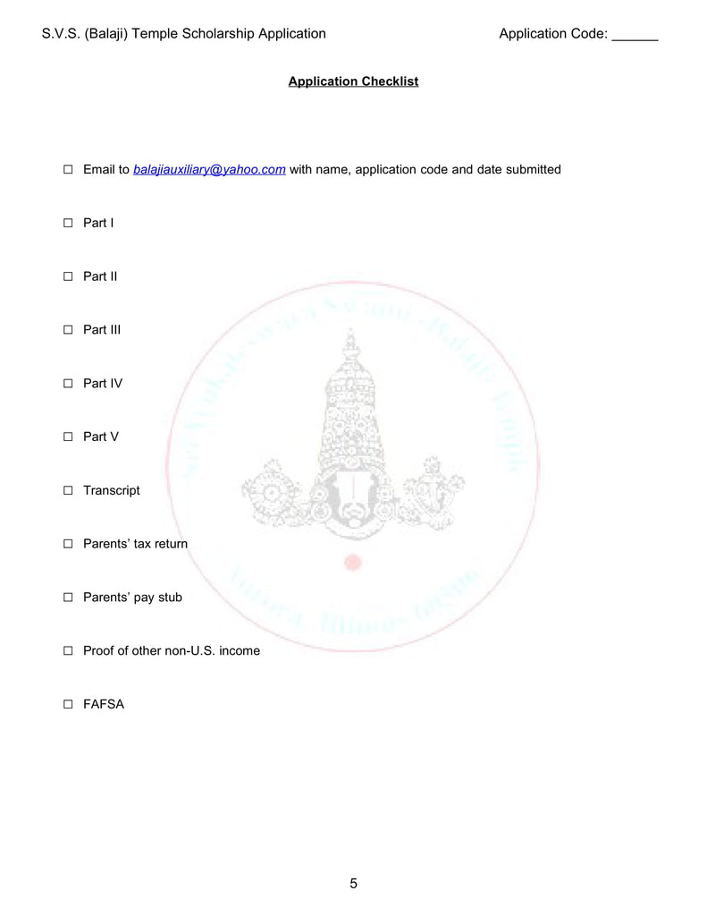 8. Applications should be placed in a sealed envelope and addressed to the Auxiliary Committee – Scholarship Application. The completed application and additional materials can be dropped off in person to the Office at the Temple or mailed to the address above. After submitting your application, please email balajiauxiliary@yahoo.com with your name, application code and the date submitted. Alternatively, all completed materials can be scanned and emailed to balajiauxiliary@yahoo.com. Please include the completed checklist as part of your application.
