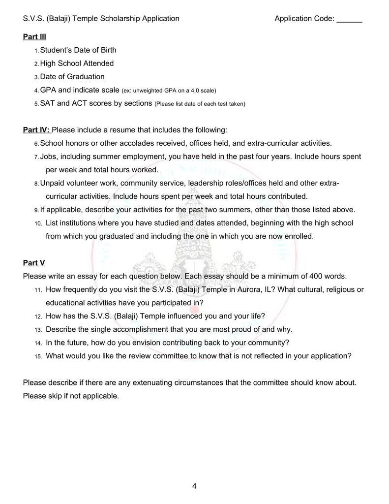 4. Parts III, IV and V should be typed, single spaced in a separate document, printed and submitted with the rest of the application (with the application code written at the top right of every page). Part III and IV should each be on a separate page. Your essays should not include your name or your parents’ names.